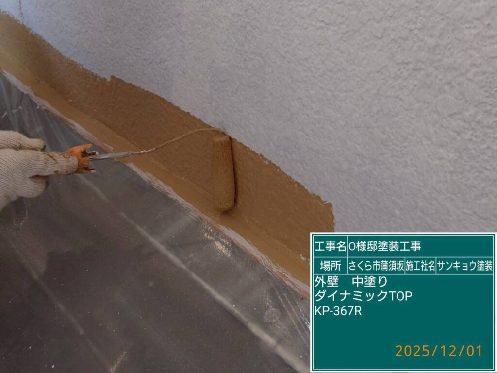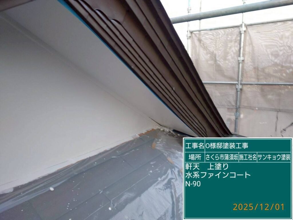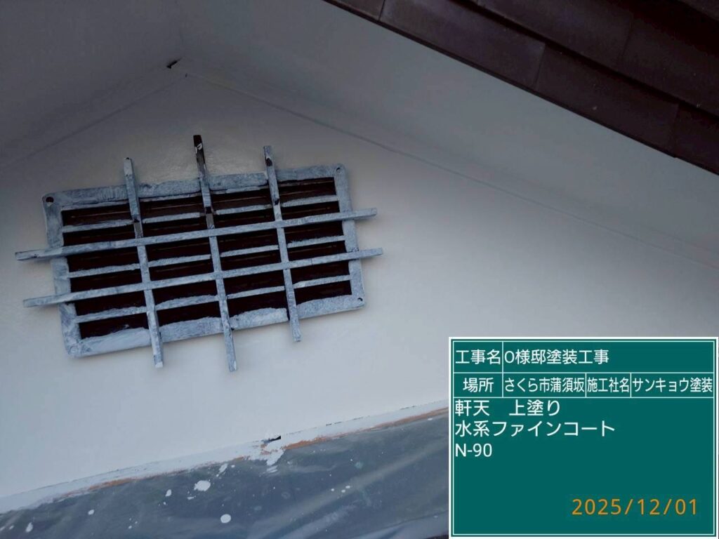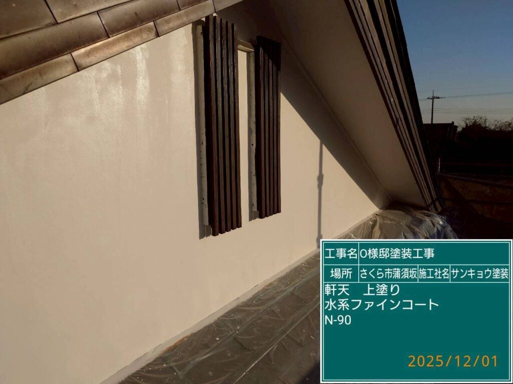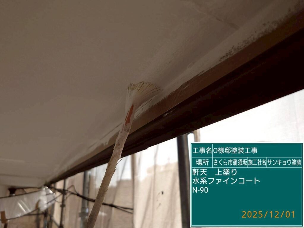 本日は軒天の上塗りと外壁の中塗りダメ込み(刷毛や小さいローラーを使用して塗る作業)をして来ました。