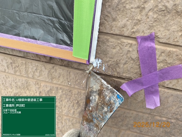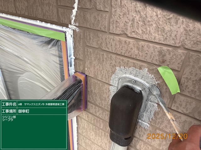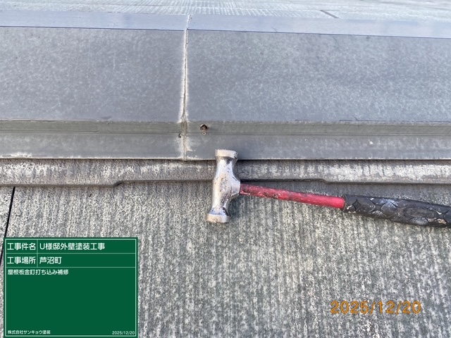 屋根 棟板金釘打ち及びコーキング止め,クラック部エポキシ樹脂補修材充填。外壁シリコン部シープラ下地処理、外壁クラック部エポキシ樹脂補修材充填などの作業をしてきました。