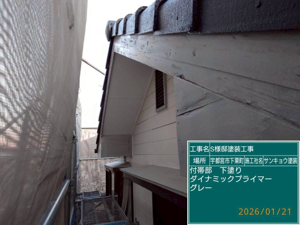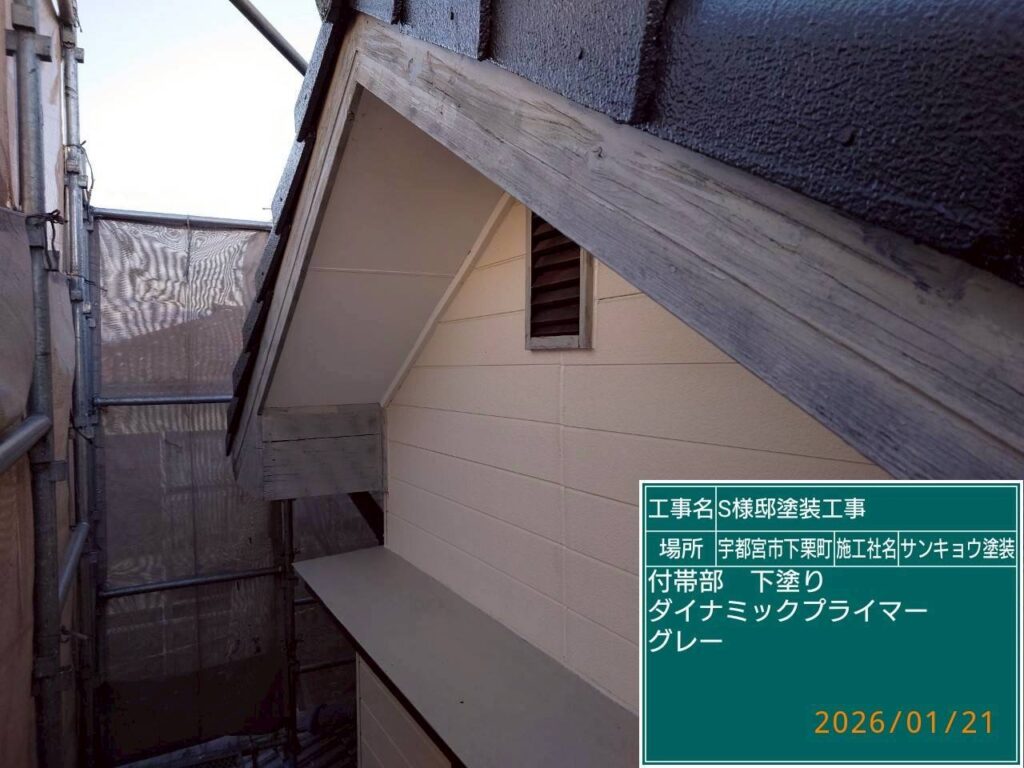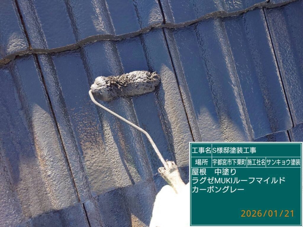 いつもありがとうございます。本日の作業内容のご説明をさせていただきます。本日も宇都宮市下栗町S様邸で大屋根の中塗りと附帯部の下塗り作業をしてきました。屋根中塗り材料は、関西ペイントの無機塗料,ラグゼmukiルーフマイルドを使用しました。
