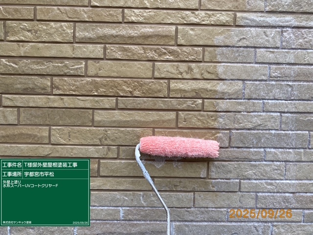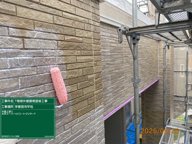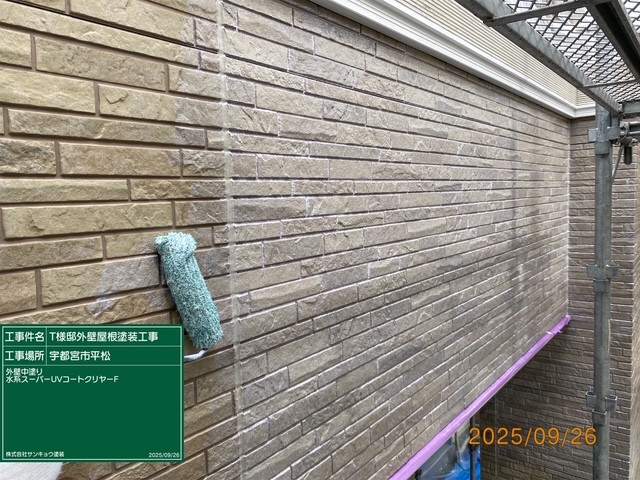 いつもありがとうございます。今日は宇都宮市平松本町T様邸で外壁クリアー塗装の中塗り及び上塗りと2階部分の外壁下塗りや軒天の上塗りをして来ました。