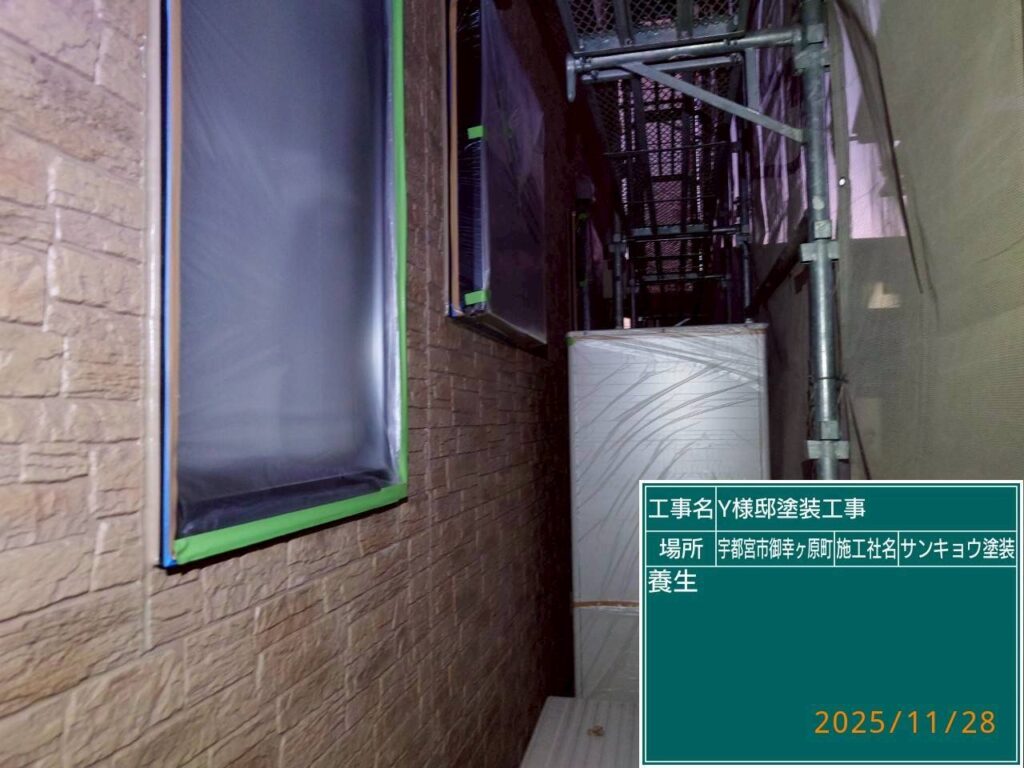 現場親方ブログ2025.11.28宇都宮市御幸ヶ原町Y様邸いつもありがとうございます。本日の作業内容のご説明をさせていただきますます。本日は宇都宮市御幸ヶ原町Y様邸で塗装工事前のビニール張り作業→養生作業をして来ました。本日の作業 2025.11.28無料お見積はこちら