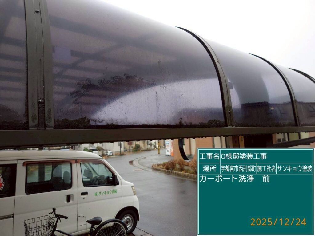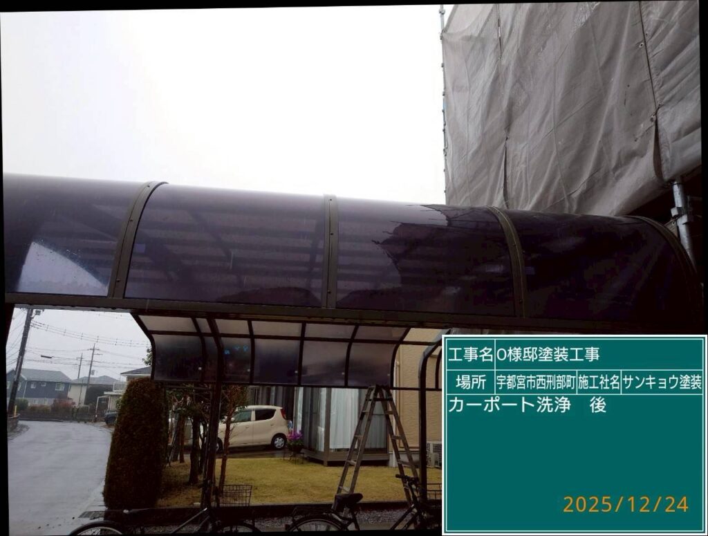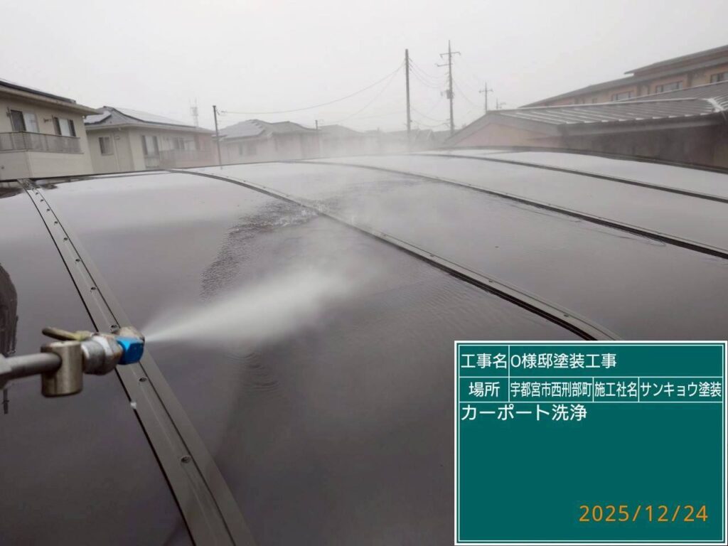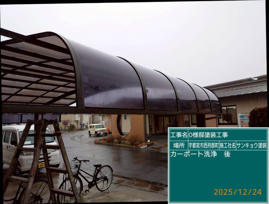 現場親方ブログ2025.12.24宇都宮市西刑部O様邸いつもありがとうございます。本日の作業内容のご説明をさせていただきます。本日は宇都宮市西刑部町O様邸の駐車場屋根の洗浄に行ってきました。本日の作業 2025.12.24無料お見積はこちら