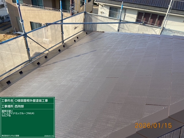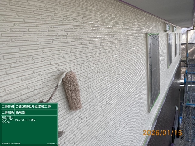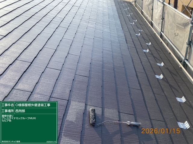 いつもありがとうございます。本日の作業内容のご説明をさせていただきます。本日も宇都宮市西刑部町O様邸で作業をしてきました。本日は屋根及び2階外壁の中塗り作業をしてきました。また,サイディング板の重ね目隙間を隙間充填用コーキング材エポフィラーを使用して埋めました。