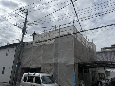 今日は工事期間中の補償と完成して引渡しからの保証についてお話いたします。弊社場合、足場を立ててから足場を解体するまでの間は、現場倍賞保険が適応されます。具体的に言うと、洗浄していて雨漏りが発生してしまった・足場工事中に部材を落としてしまい窓ガラスを割ってしまった・近隣のお子さんが庭に入って来て足場材に躓き怪我をしてしまったなど工事中に関する原因で損害を与えてしまった場合の保険になります。