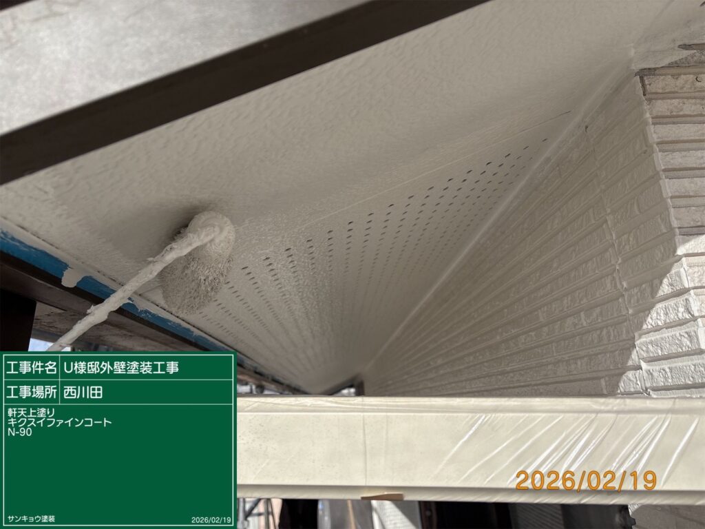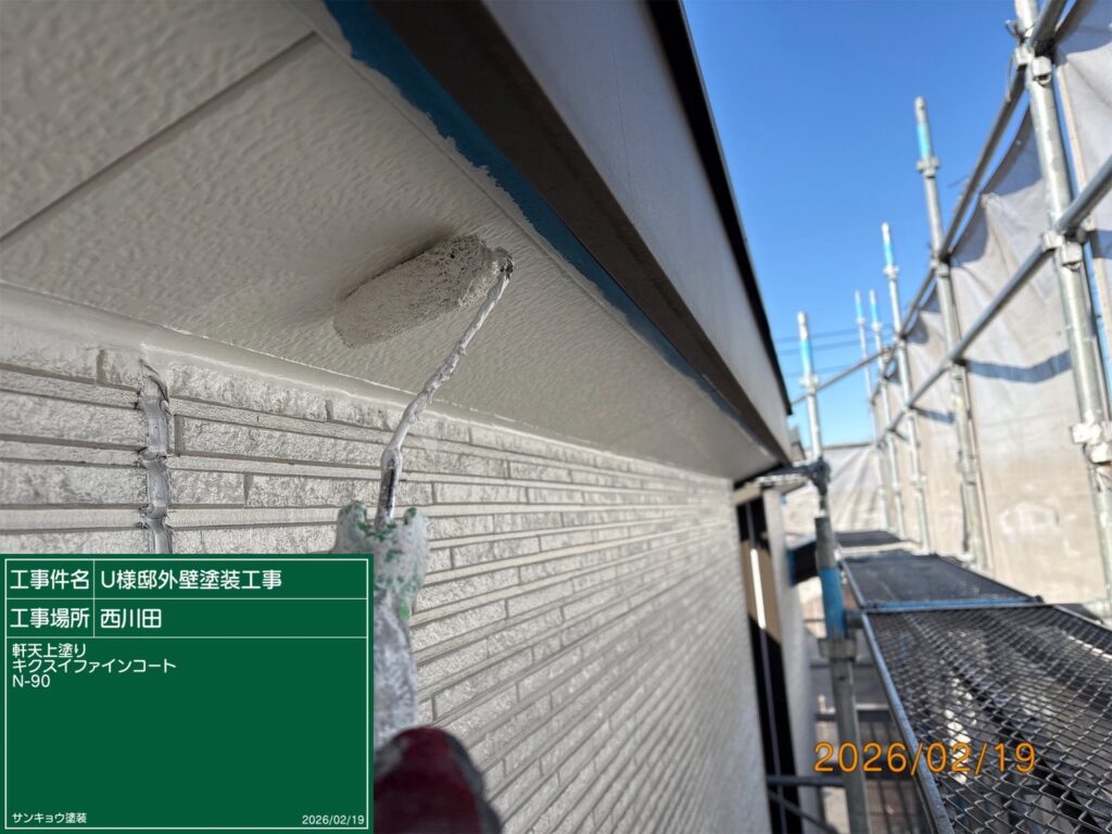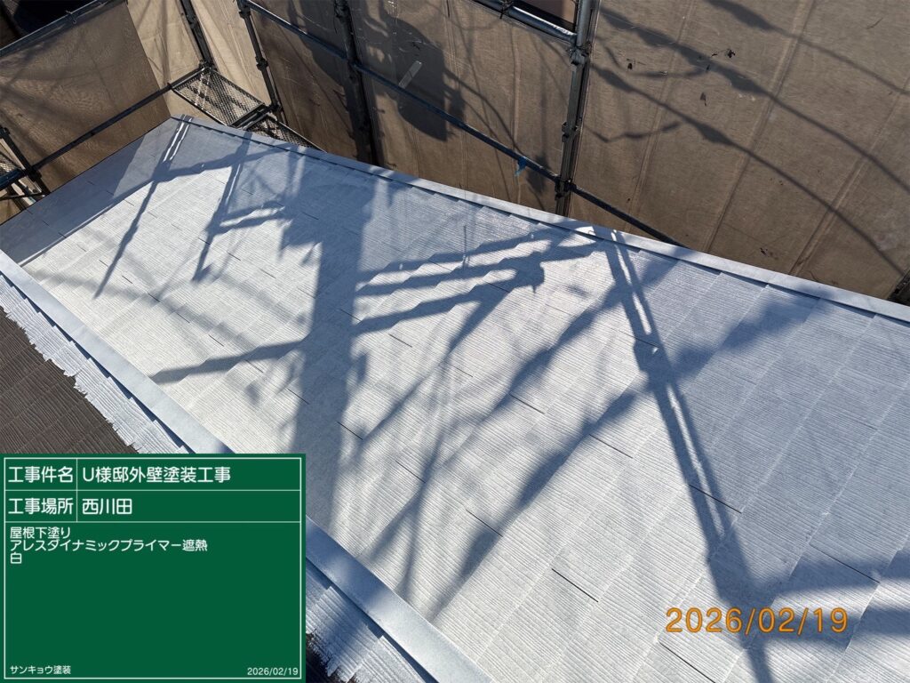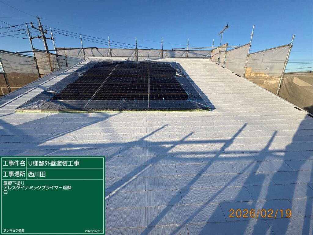 いつもありがとうございます。本日の作業内容のご説明をさせていただきます。本日は宇都宮市西川田町U様邸で外壁の中塗りと上塗り、軒天の上塗りや屋根クラック板金補修とエポキシ樹脂補修から下塗りをダイナミックプライマー遮熱を塗布しました。