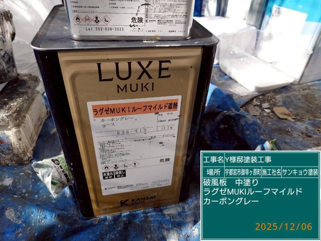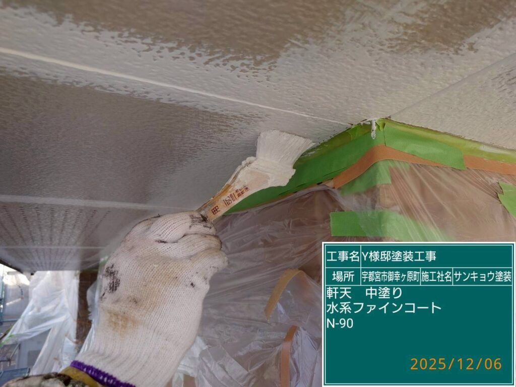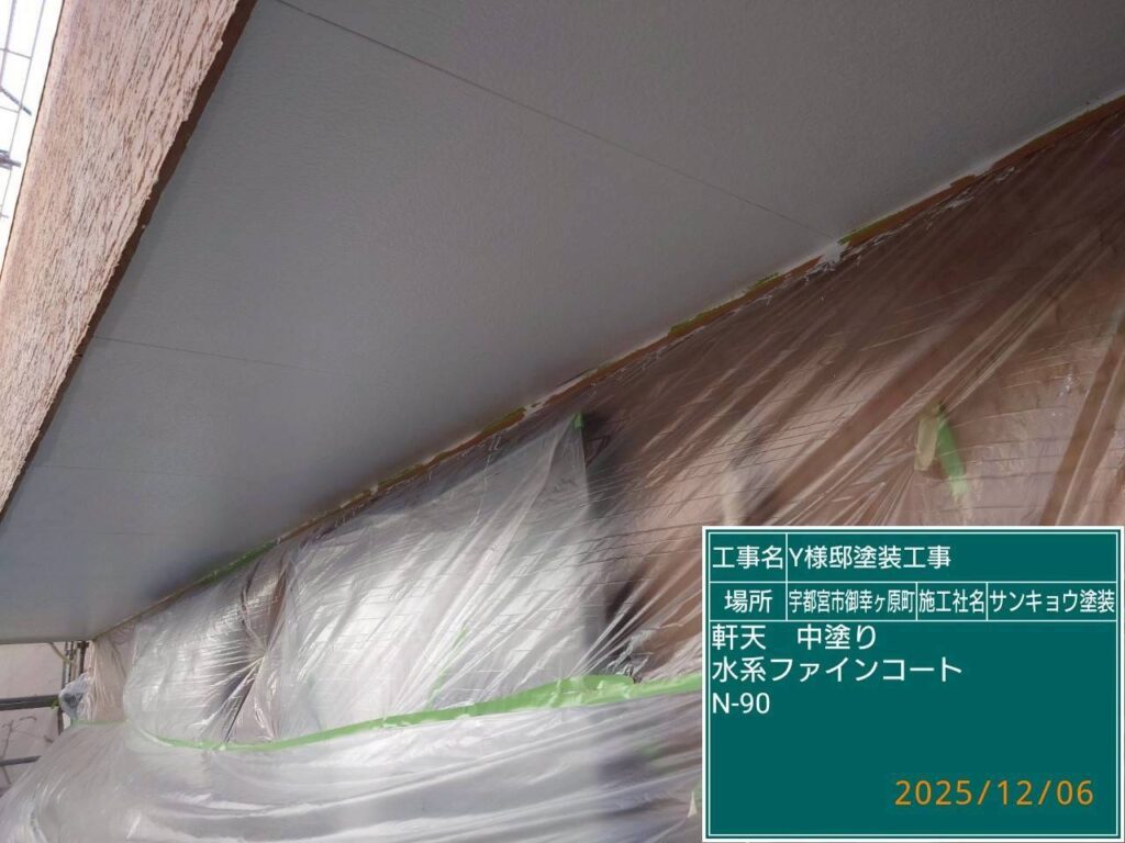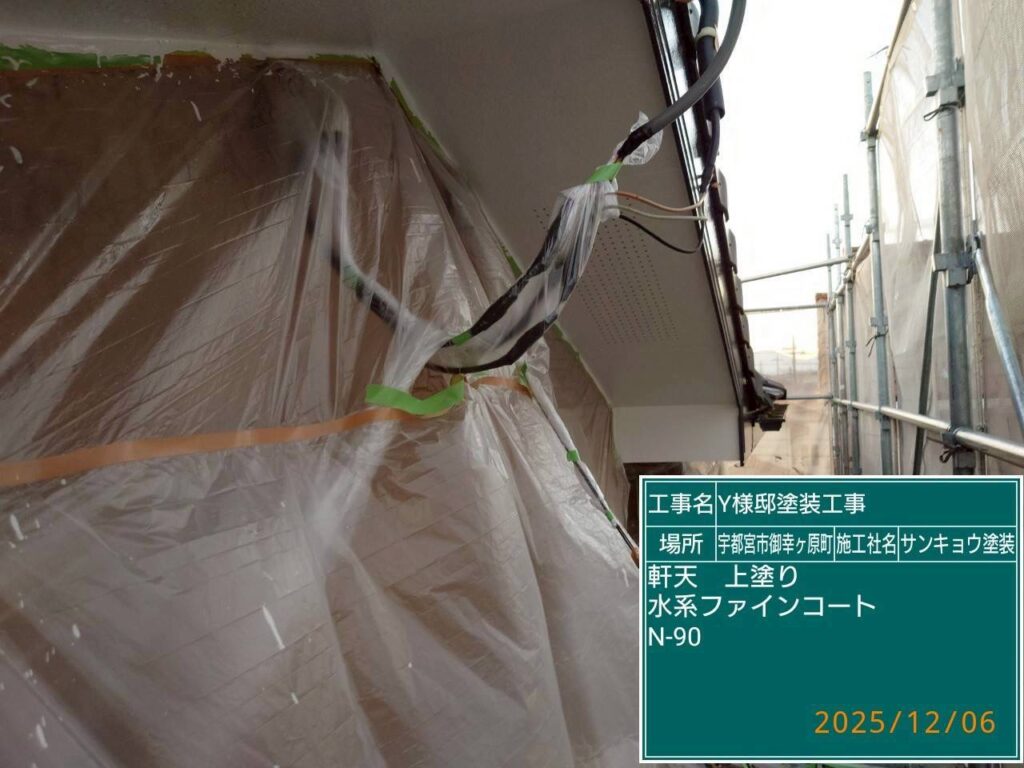 いつもありがとうございます。本日の作業内容のご説明をさせていただきます。本日は軒天の中塗りと上塗り、鼻隠し、の軒樋の中塗り作業をしてきました。附帯部の材料は無機塗料を使用しています。