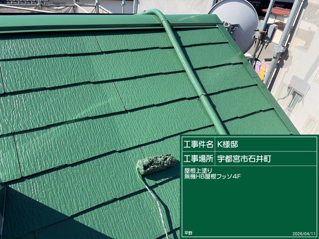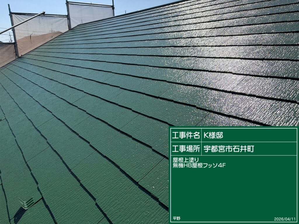 現場親方ブログ2026.04.11屋根上塗り 宇都宮市石井町K様邸2027.4.11こんにちは!現場担当の平野です。今日は宇都宮市石井町k様邸で屋根の中塗りから上塗りの作業をしてきました。使用材料は、イナバ塗料の無機HB屋根フッソ遮熱を使用しました。無料お見積はこちら