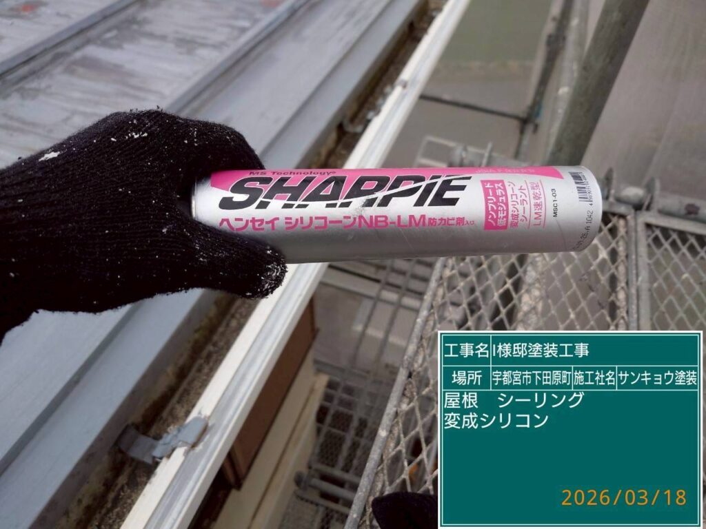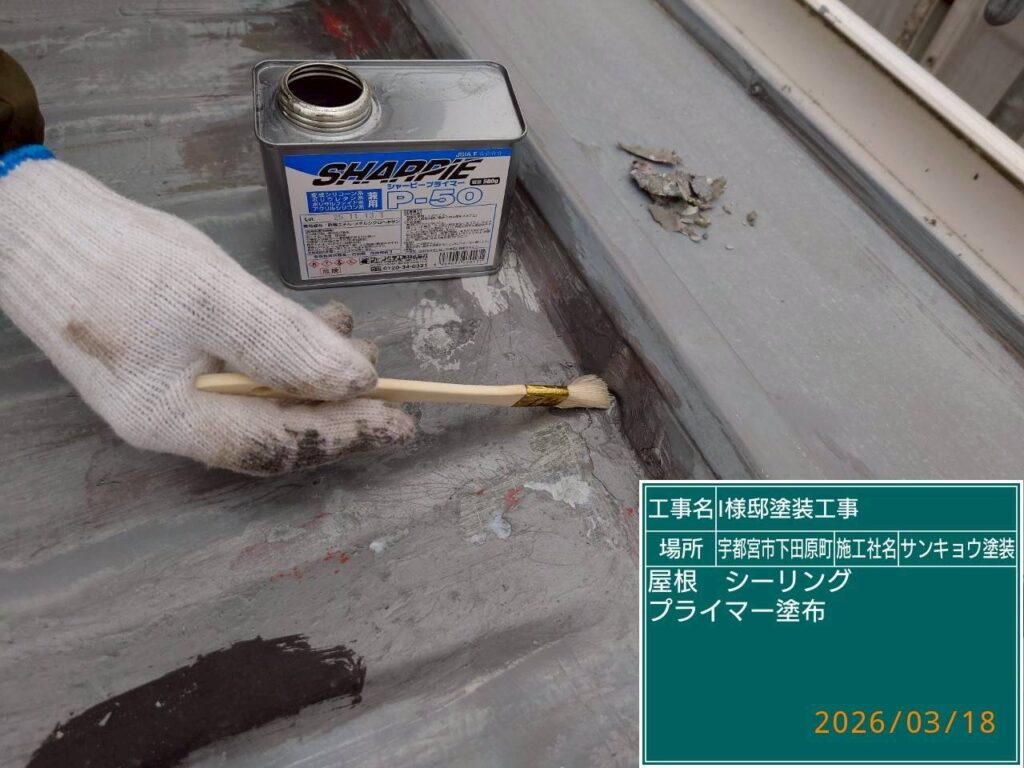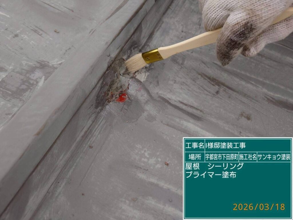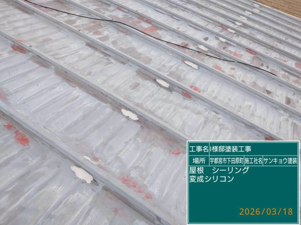 こんにちは現場担当の川又です。今日は宇都宮市下田原町I様邸で屋根板金部のコーキング処理をしてきました。このタイプの屋根は珍しく断片的にコーキングがされておりコーキングの下に細かい穴が空いています。この部分のコーキングの処理をしてほしいとお客様から依頼され錆止めを塗装する前にコーキングの打ち替えと打ち増しをしてきました。