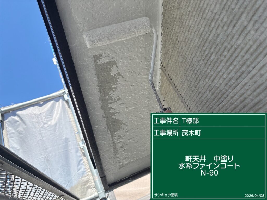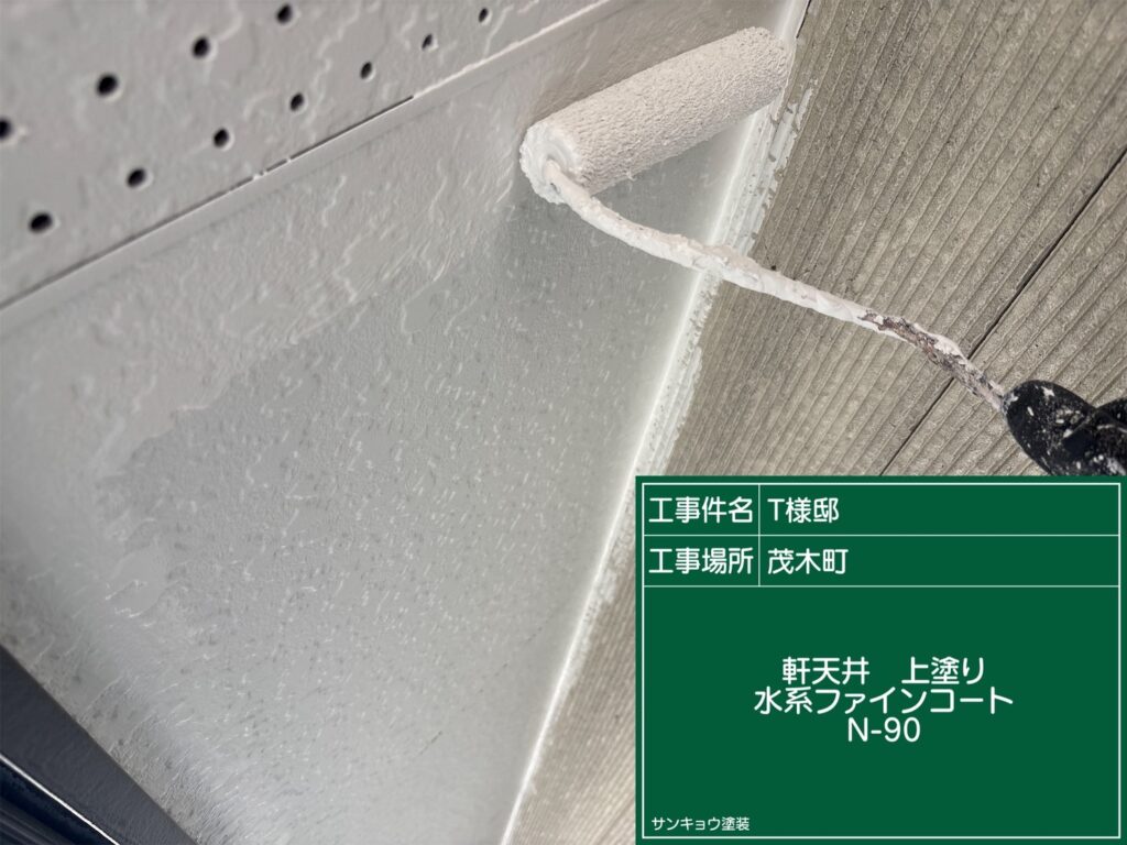 こんにちは!現場担当の小森です。今日は茂木町T様邸の軒天中塗りから上塗り作業をしてきました。