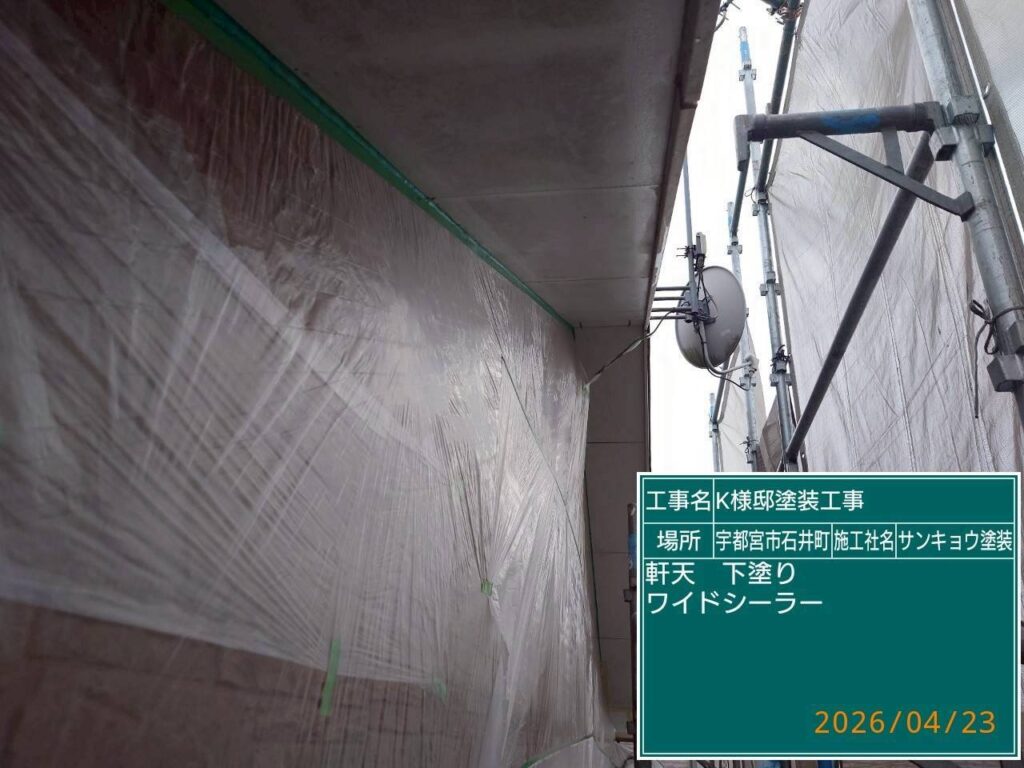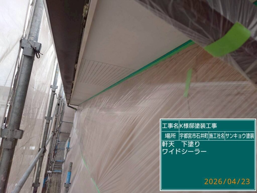 現場親方ブログ2026.04.23軒天塗装 宇都宮市石井町K様邸2026.4.23こんにちは!現場担当の川又です。今日は宇都宮市石井町のK様邸で軒天下塗りから上塗りの刷毛塗り作業を午前中行いました。昼からは雨天のため中止です。無料お見積はこちら
